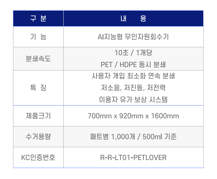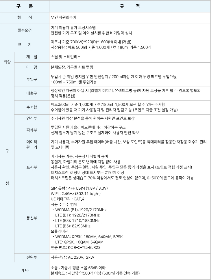 AI 기능탑재 : 수거자원 분석, 포인트 지급, 사용한도, 사용법 안내 - 보상 포인트 적립 : 휴대폰, 지역카드, 교통카드, 지역 쓰레기 배출카드 등 추가 확대 예정 - 보상방법 : 적립 포인트에 해당되는 상품 쿠폰 지급 등 추가 확대 예정 - 저장용량 : 페트재질 1,000개, 캔 1,500개 (월별 수거량 자동 통보) - 저소음, 동절기 김서림 방지 - 고객 맞춤형 디자인 랩핑, 비가림막(캐노피)/전원공사 가능 - 1개당 포인트 지급(포인트 지급 조건 설정 가능)